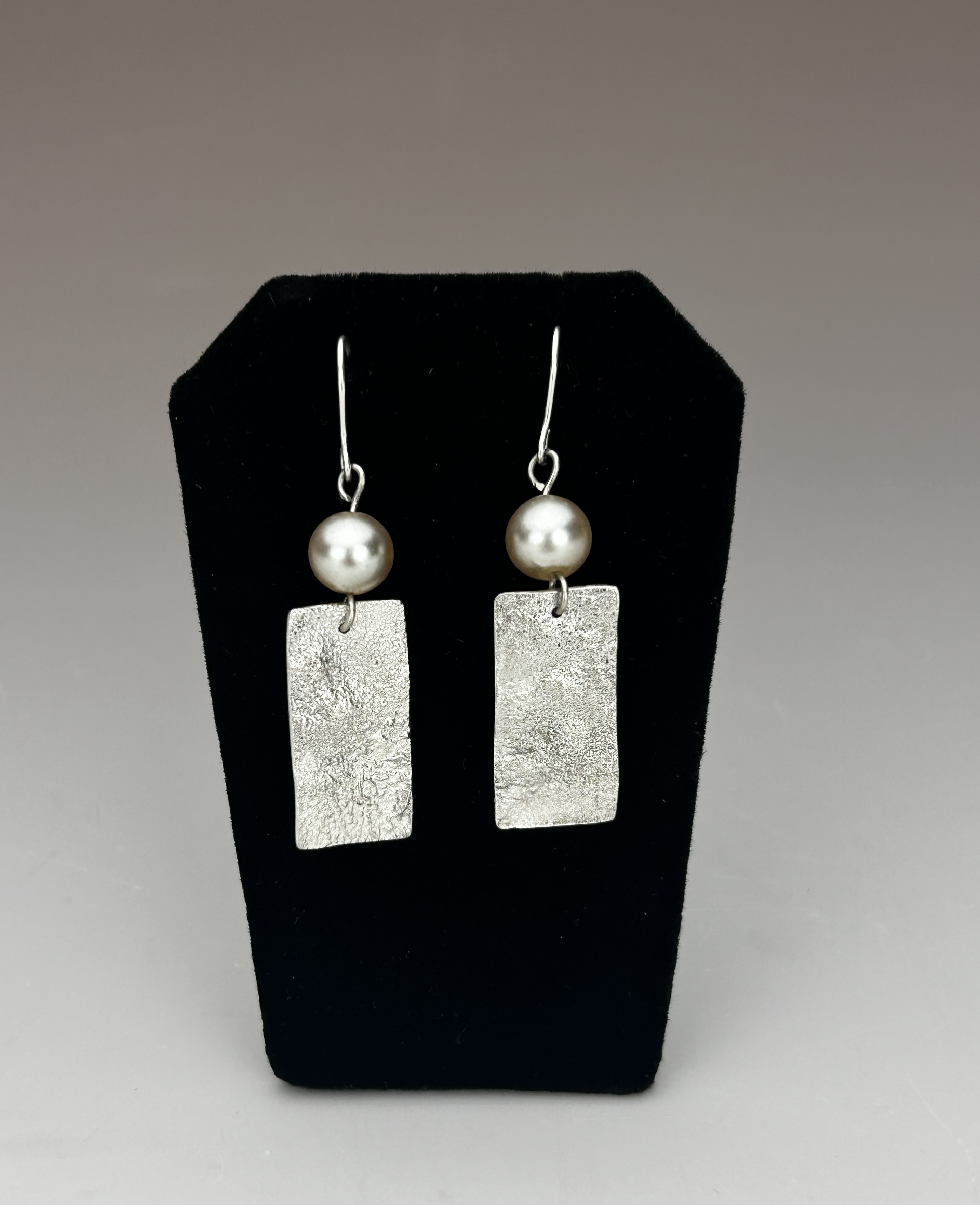 Reticulated silver earrings with secondhand glass pearl beads